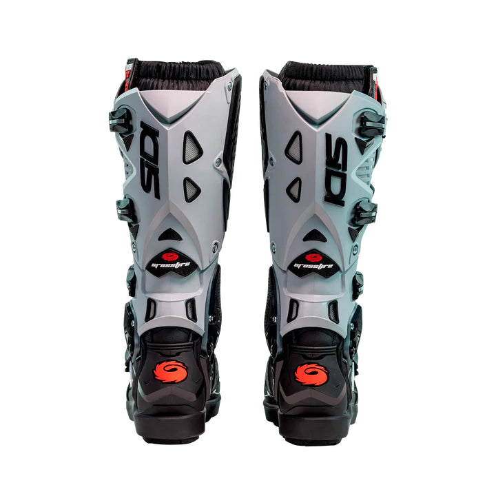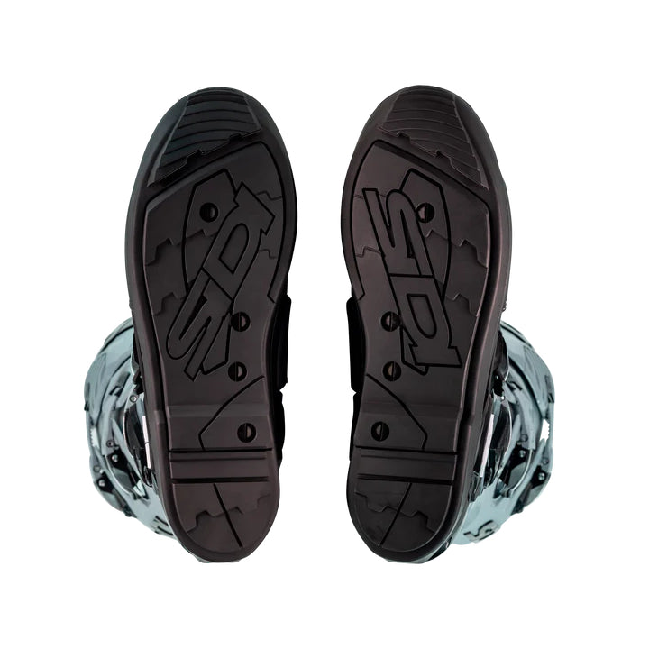 El sistema Dual Flex utilizado en el SIDI Crossfire 3 SRS no solo limita la hiperflexión lateral, sino que también presenta topes duros en el límite del rango de movimiento anatómicamente permitido que limitan la hiperextensión de la articulación del tobillo. La capacidad de ajuste del exclusivo sistema Dual Flex con sus cuatro correas independientes flotantes permite que las botas Crossfire 3 SRS brinden a cada motociclista un ajuste personal sin importar la forma de su cuerpo o si se usan o no rodilleras.