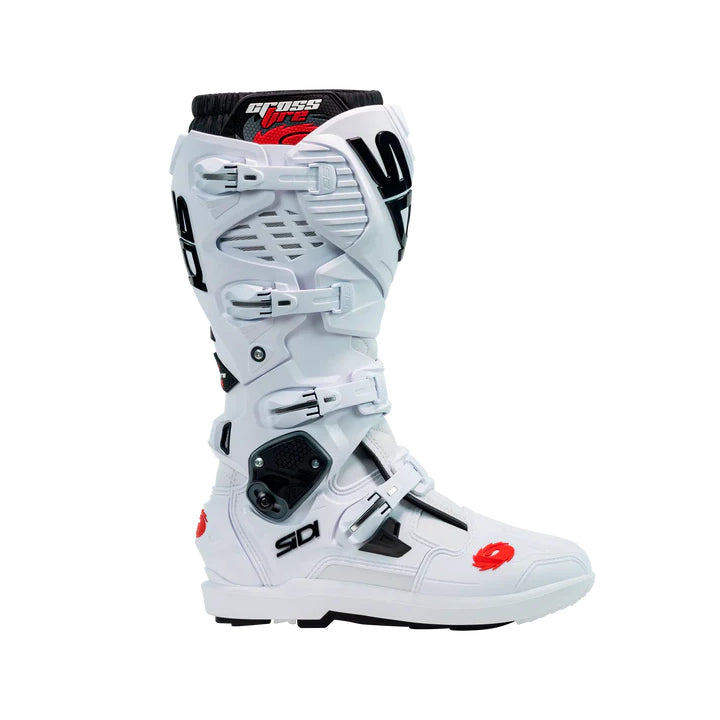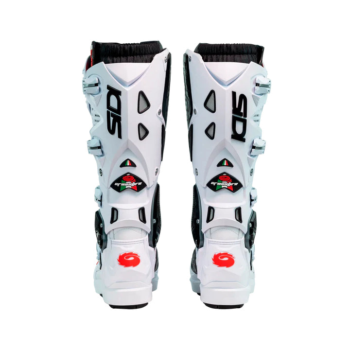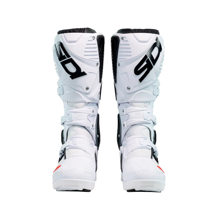 El sistema Dual Flex utilizado en el SIDI Crossfire 3 SRS no solo limita la hiperflexión lateral, sino que también presenta topes duros en el límite del rango de movimiento anatómicamente permitido que limitan la hiperextensión de la articulación del tobillo. La capacidad de ajuste del exclusivo sistema Dual Flex con sus cuatro correas independientes flotantes permite que las botas Crossfire 3 SRS brinden a cada motociclista un ajuste personal sin importar la forma de su cuerpo o si se usan o no rodilleras.