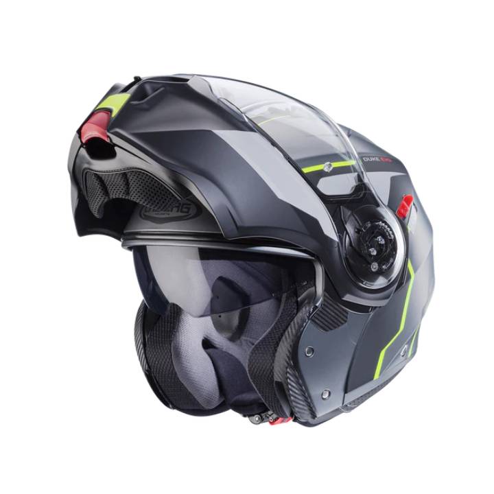 El nuevo casco DUKE EVO cumple con los altos requisitos de seguridad establecidos por la última normativa de la UE ECE 22.06. Muchas son las características del nuevo DUKE EVO como: una dimensión de calota compacta y un peso excelente para un casco modular de alrededor de 1600 gramos; el forro de confort está fabricado con tejidos más transpirables e hipoalergénicos en comparación con el casco DUKE y las almohadillas de las mejillas se han desarrollado con tecnología 3D para ofrecer una mejor adherencia a la cara, especialmente cuando se conduce con la mentonera abierta; un sistema de apertura de mentonera nuevo y fácil...