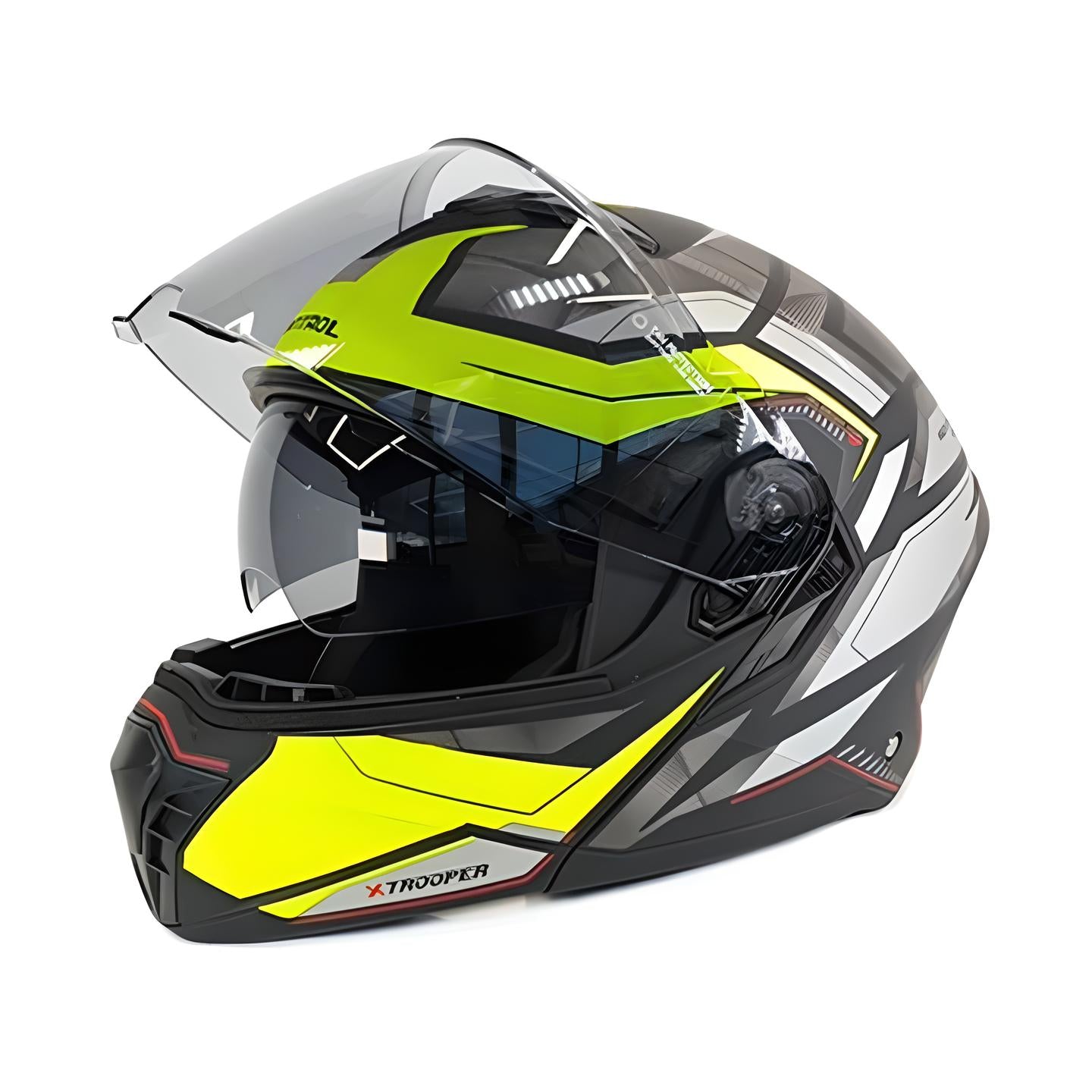 El Casco Kontrol Trooper Abatible ofrece máxima protección con su coraza externa inyectada con termoplásticos especiales para impactos. Su tapizado hipoalergénico, desmontable y lavable, asegura comodidad, mientras que su visor removible y sistema de ventilación interna optimizan la frescura. Disponible en tallas S, M, L y XL, y con un peso de 1420 gr, cuenta con la certificación FMVSS 218. DOT para una seguridad garantizada.