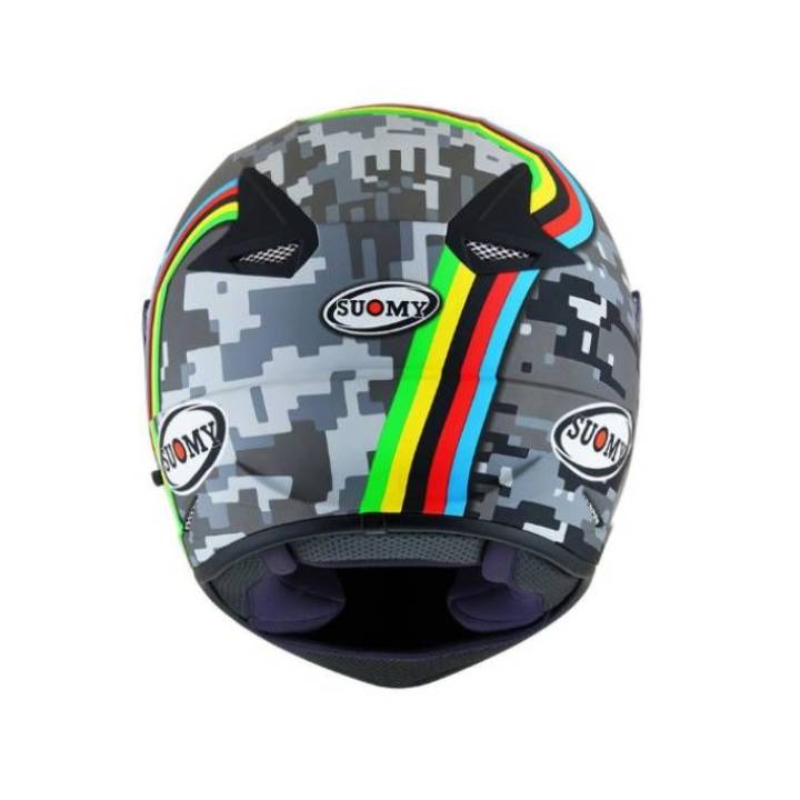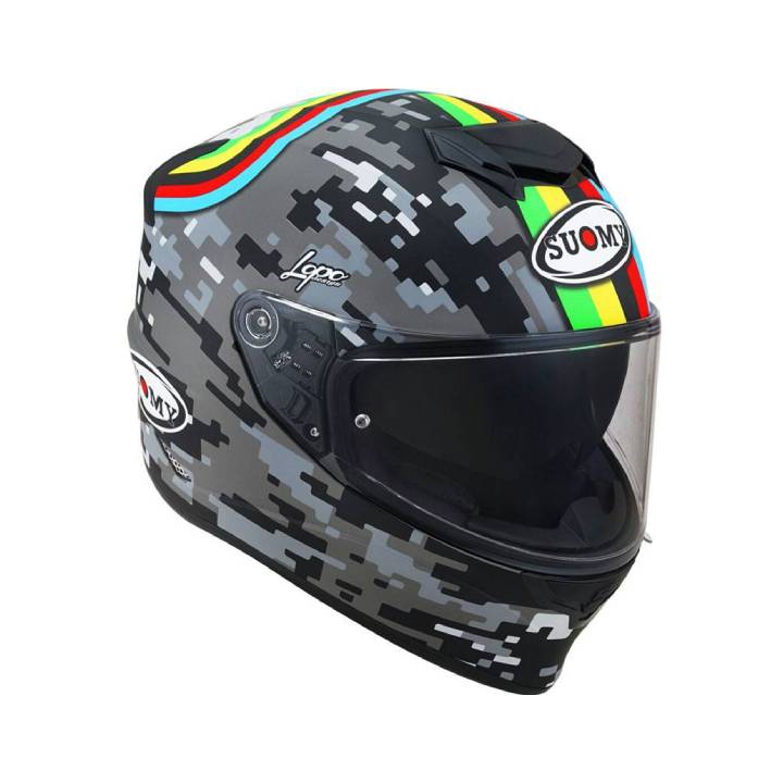 La empresa italiana Suomy, desde su fundación en 1997, está estrictamente orientada al mundo de las carreras, donde conocimientos obtiene e información valiosa para el desarrollo y la creación de cascos, los cuales año tras año, se amplía y mejora, enriqueciéndose con una amplia gama de modelos, desde pista a todoterreno, pasando por sport touring y jets Exterior compuesto de resina termoplástica reforzada ADT Excelente ventilación, tomas y extracciones de aire diferentes. Interior hecho en material transpirable e hipoalérgico, fácilmente extraíble y lavable. Impresionante campo de visión Visera solar integrada Pinlock Max-visión antiempañante incluido Sistema de retención de hebilla micrométrica....