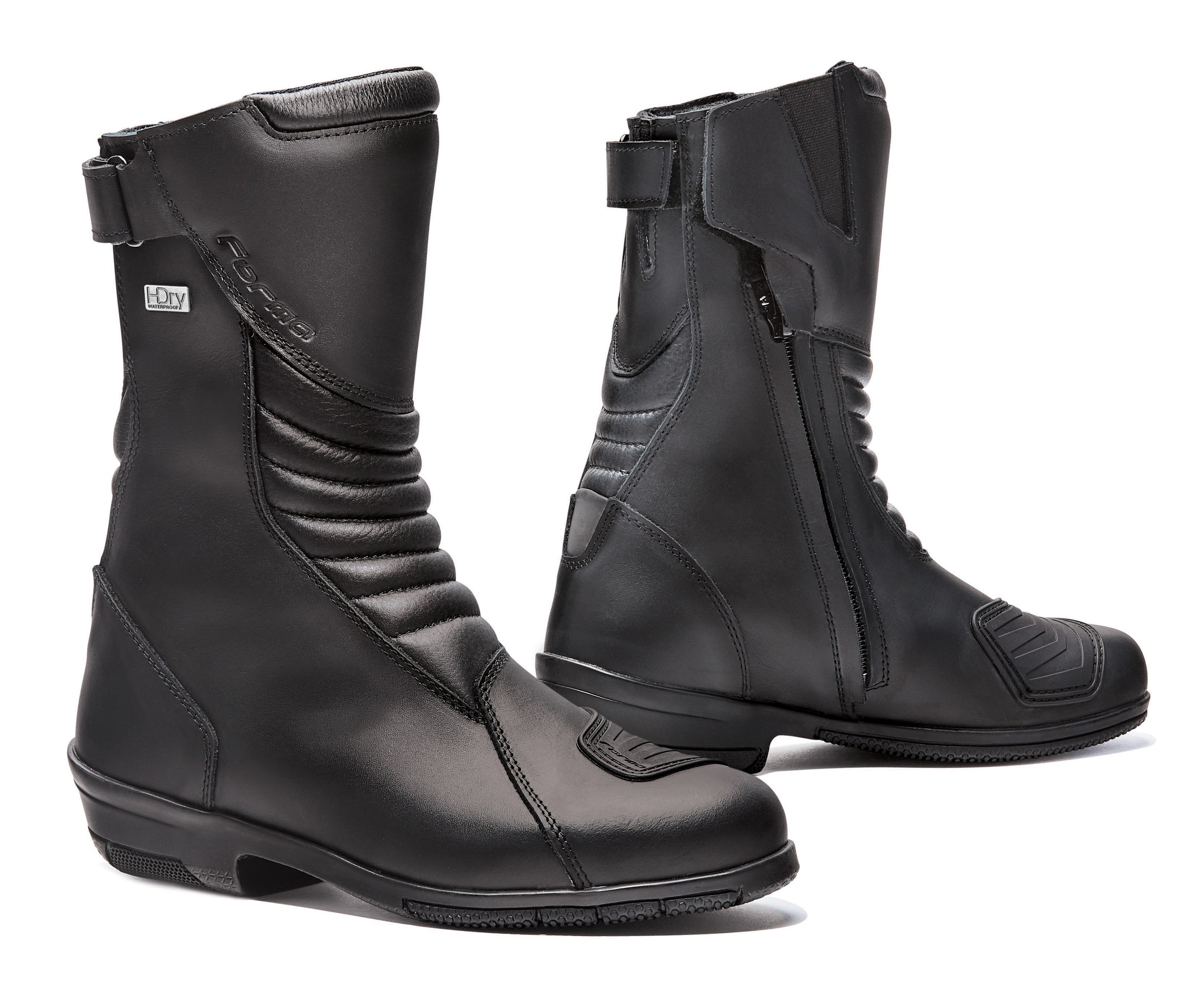 Exterior Parte superior en puro cuero Suela de goma de tacón medio touring Protección de almohadilla de palanca de cambios de plástico Cuello acolchado en la bota para mayor comodidad Paneles laterales y traseros elásticos para un mejor ajuste Cierre con velcro y cremallera Velcro trasero para ajuste de pantorrilla Inserción reflectante trasera Interior Membrana impermeable y transpirable HDry®, laminada en 3D directamente en la parte superior Protecciones de plástico moldeado en TPU en espinilleras y tobillos Acolchado de polímero suave con espuma viscoelástica PP Mid Dual Flex con entresuela de fieltro antigolpes Plantilla reemplazable antibacteriana con A.P.S. (Air Pump System)...