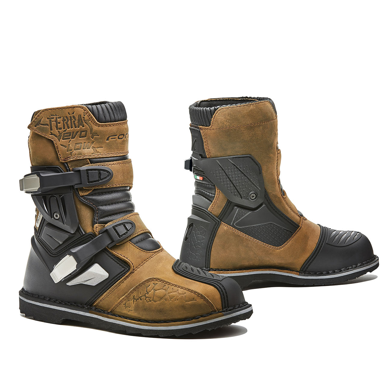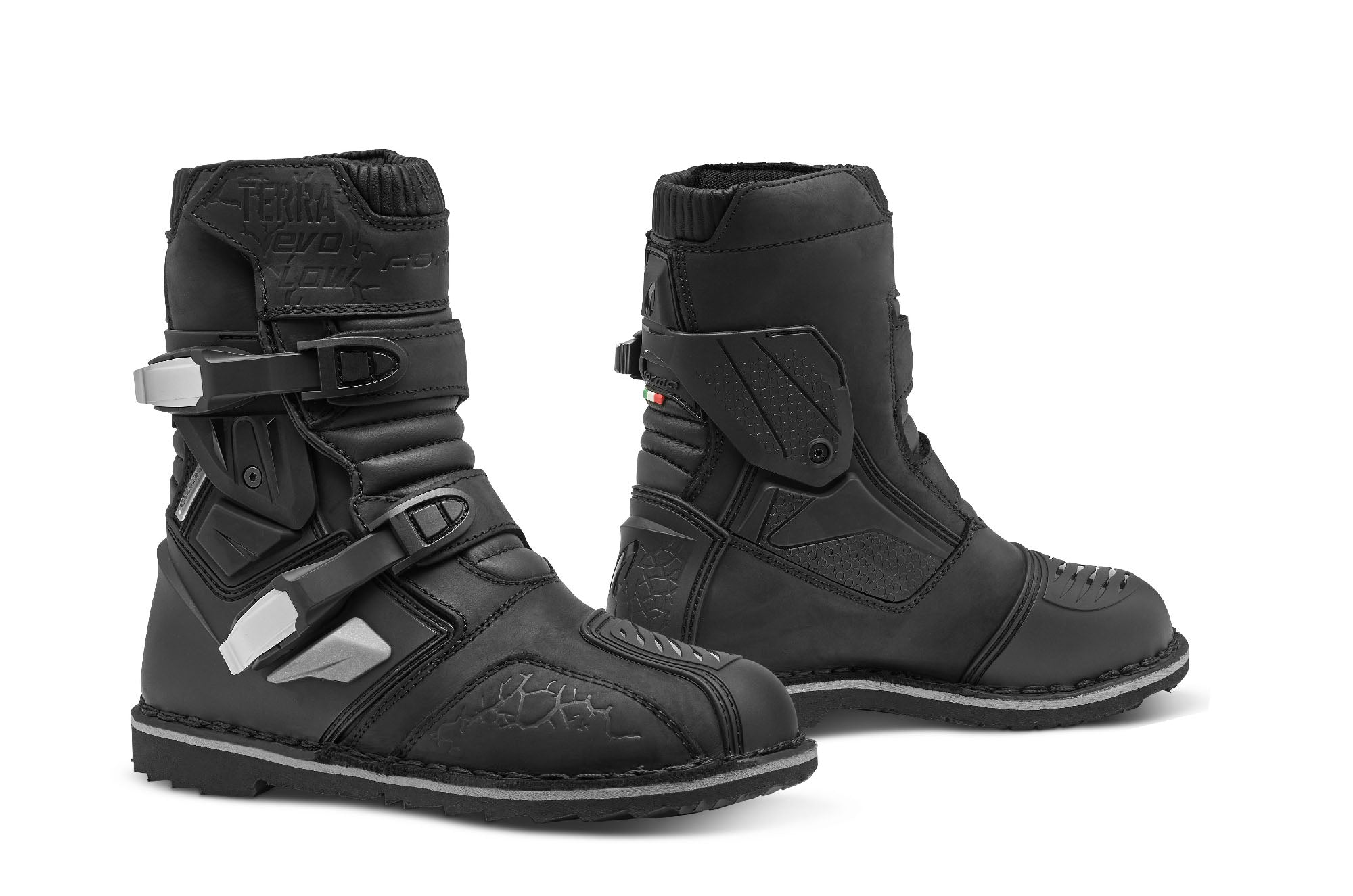 Si está aventurándose lejos de caminos pavimentados y bien mantenidos, sus pies necesitarán más protección que las tradicionales botas de aventura.La suela ‘Ideal Welt’ del nuevo Terra Evo Low tiene una mayor rigidez para un mayor nivel de protección off-road, y también proporciona más durabilidad para las rodadas de larga distancia. La estructura principal de la bota está fabricada en piel grasa con un nuevo sistema de soporte de tobillo FCS para permitir un soporte máximo sin comprometer la comodidad. FORMA Sizes Chart Exterior Parte superior en piel tratada con aceite Suela de goma en compuesto específico para Enduro/ Adventure...